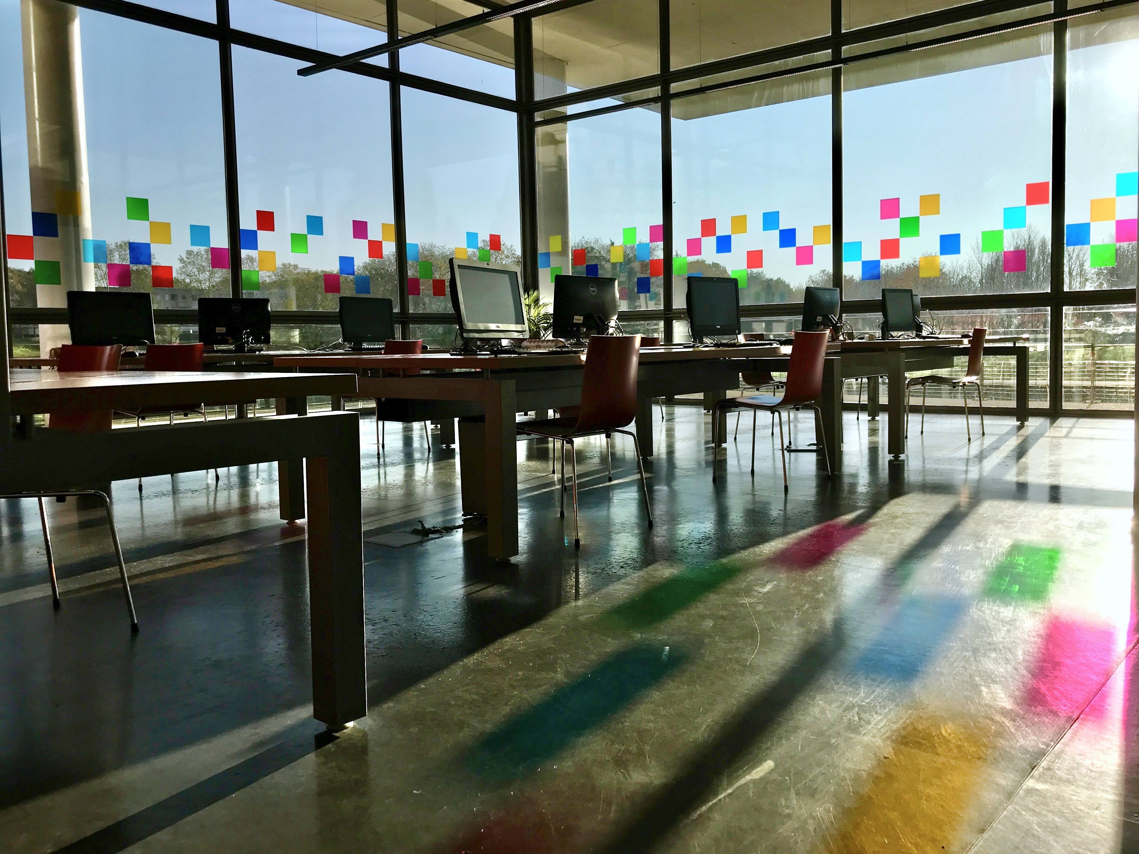 Made from six shades of MACcrystal 8400 vinyl, the window decals interact with the architecture and transform the light according to the time of day and the seasons. They invite visitors to rediscover the campus through chromatic variations that oscillate between subtle vibrations and intense bursts of color. On sunny days, the rays projected onto the floors and walls create veritable frescoes of light in spectacular colors, an effect made possible by the transparency of MACcrystal 8400 films.